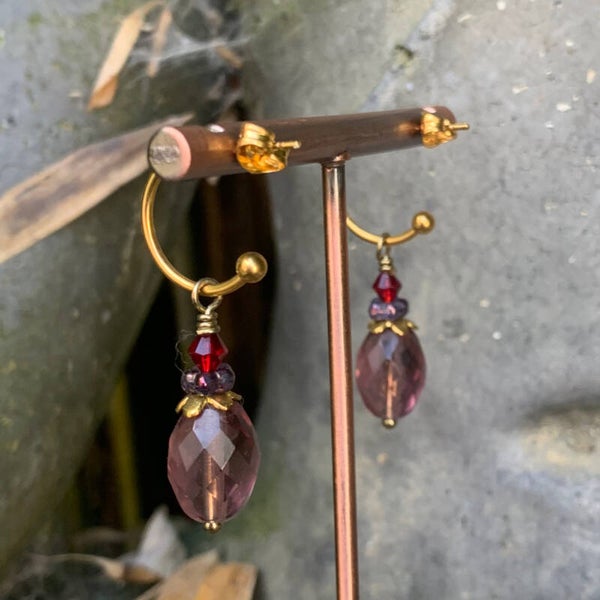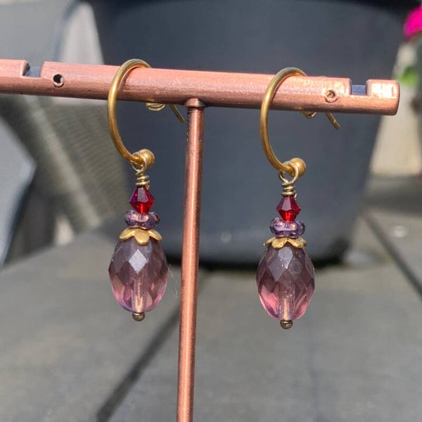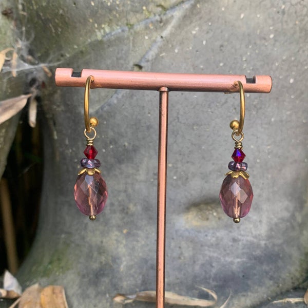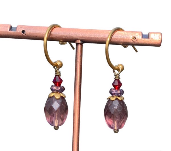 De mooie facet geslepen ovale Tsjechische glaskraal heeft een afmeting van 13 x 10 mm. De kleur is zacht paars/aubergine doorschijnend. Daarboven een rode bicone kraal.